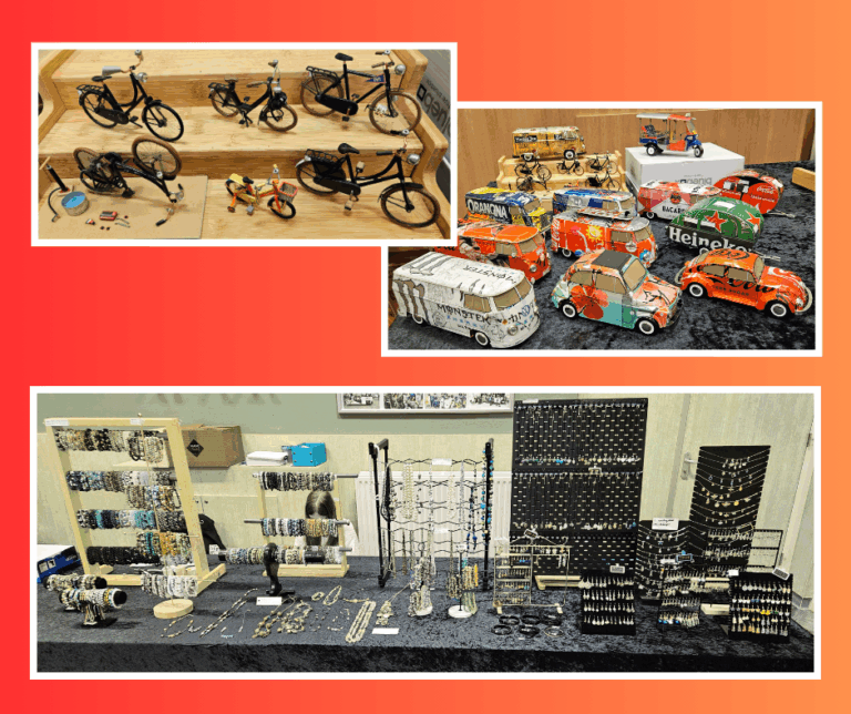 Vader Ton, maakt oldtimers van blikjes van diverse merken en maakt ook miniatuur fietsjes van stroomdraad, plastic dekseltjes, hout, dopjes etc.